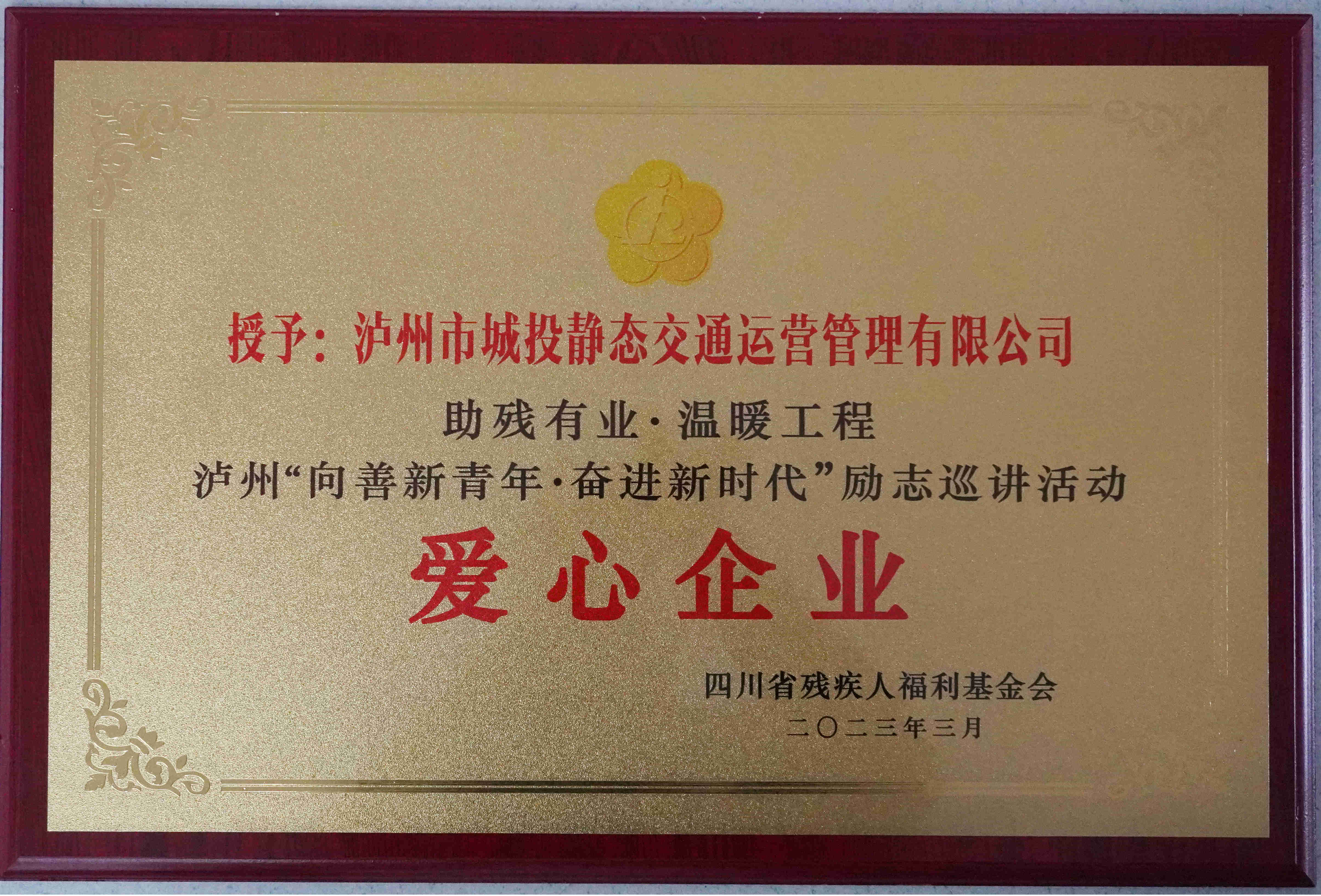 3月29日,在“助殘有業(yè)·溫暖工程”暨“酒城助殘就業(yè)創(chuàng)業(yè)公益聯(lián)盟”啟動儀式上,瀘州城投集團下屬靜態(tài)交通公司被授予“愛心企業(yè)”榮譽稱號。