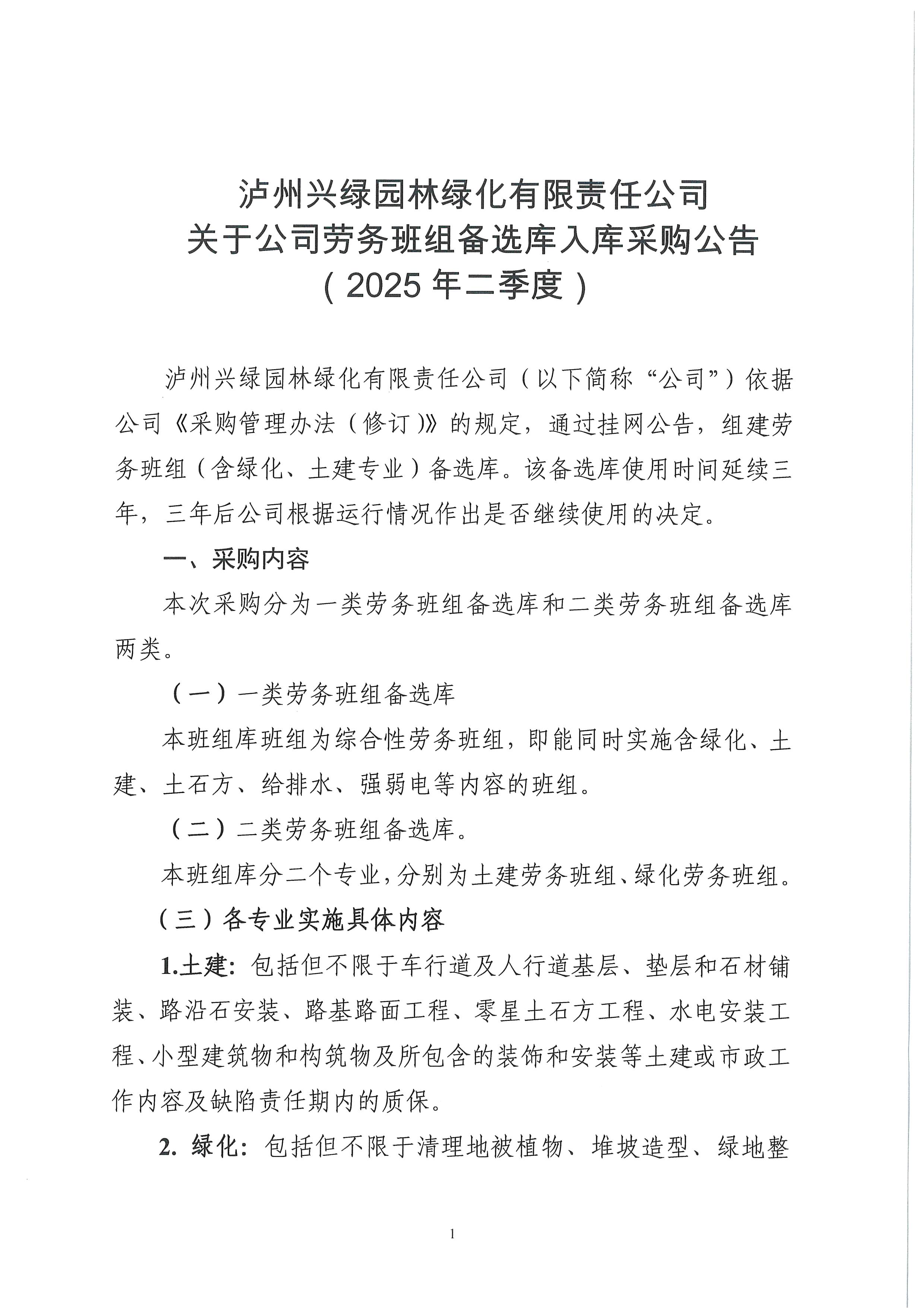 瀘州興綠園林綠化有限責(zé)任公司關(guān)于公司勞務(wù)班組備選庫入庫采購公告(2025年二季度)